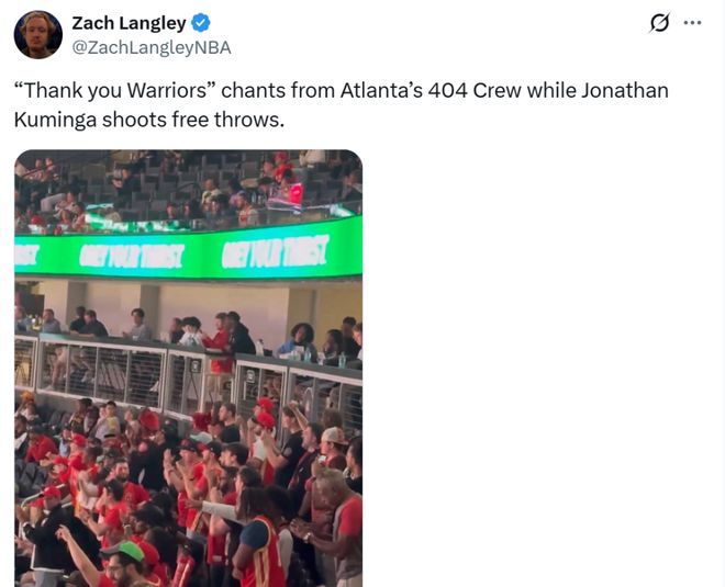 因此在比赛中库明加一次又一次打出傲人表现后,现场老鹰球迷嗨翻了,在库明加罚球时大量球迷齐声高呼:“Thank you Warriors(谢谢你,勇士)”