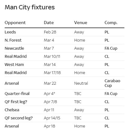 3月7日,曼城将客场对阵纽卡斯尔,随后将在3月10日或11日做客伯纳乌。3月14日,曼城客场对阵西汉姆。3月17日或18日,曼城将在主场对阵皇马。3月22日,曼城将在联赛杯决赛里对阵阿森纳。