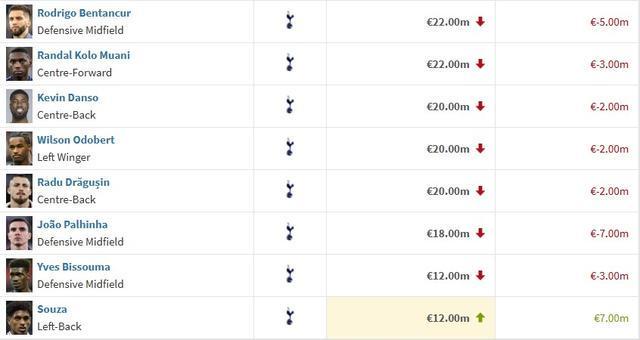 北京时间3月9日,德转更新了英超联赛球员的身价,热刺一共有17人身价有变化,其中16人下跌,罗梅罗、哈维-西蒙斯和库卢塞夫斯基均下跌1000万欧元,仅有小将索萨上涨了700万欧。